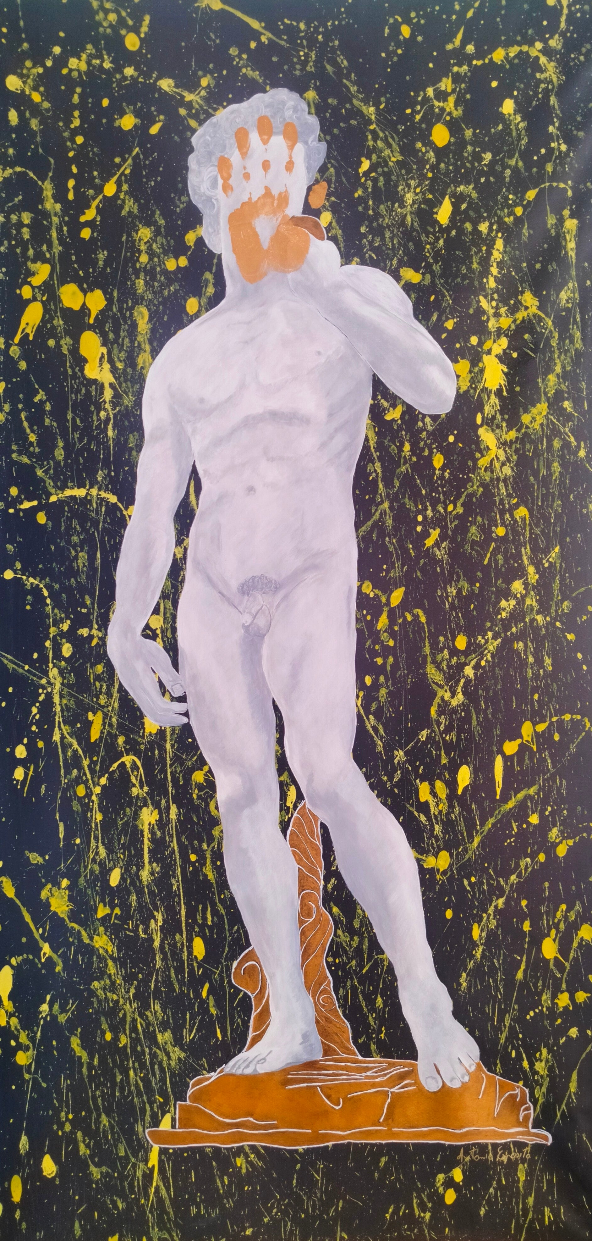 Nel David, paradigma dell’identità compiuta, il volto viene coperto. Questo gesto, apparentemente sottrattivo, produce in realtà uno slittamento ontologico: ciò che era luogo di riconoscimento diventa superficie opaca. Jean-Luc Nancy ha scritto che l’immagine non è ciò che mostra, ma ciò che espone; e qui l’esposizione non riguarda più il soggetto rappresentato, ma il limite stesso della rappresentazione. Il giallo che attraversa la figura non aggiunge, ma interrompe: è un evento che incrina la continuità tra forma e significato.