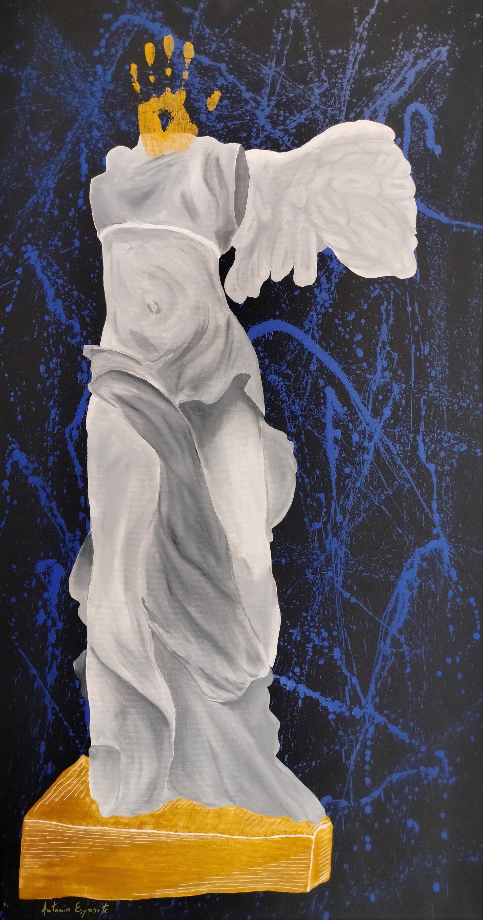 È nella Nike di Samotracia che il lavoro raggiunge la sua massima radicalità. Qui l’assenza non è più un evento, ma una condizione. L’impronta non interviene su un’identità da negare o trasformare, ma su un vuoto già esistente. Jacques Derrida, riflettendo sulla traccia, la definisce come ciò che permane in assenza di origine: un segno che non rimanda a una presenza piena, ma a una differenza. In questo senso, la Nike non rappresenta più un corpo, ma una soglia. Il blu, profondo e aperto, amplifica questa dimensione, trasformando lo spazio pittorico in un campo di possibilità, piuttosto che in un luogo di definizione.